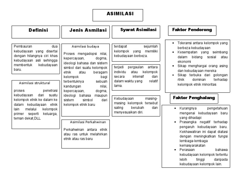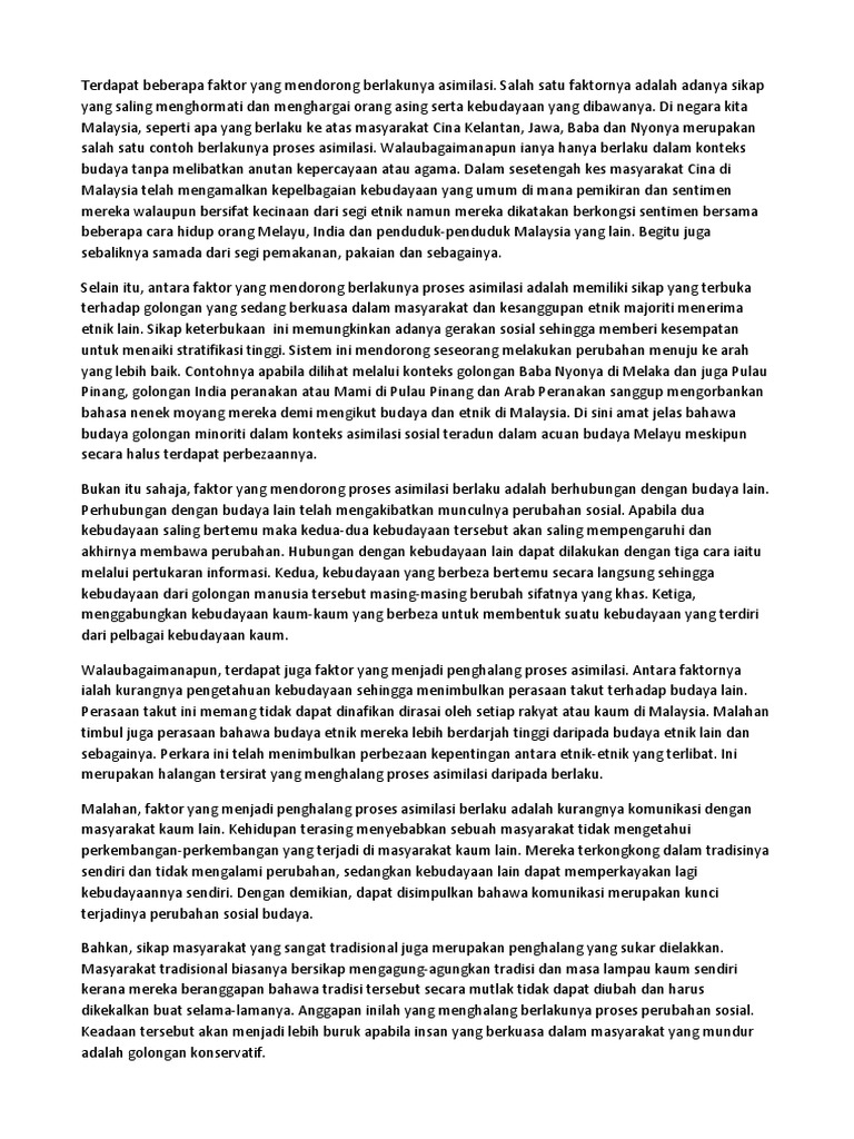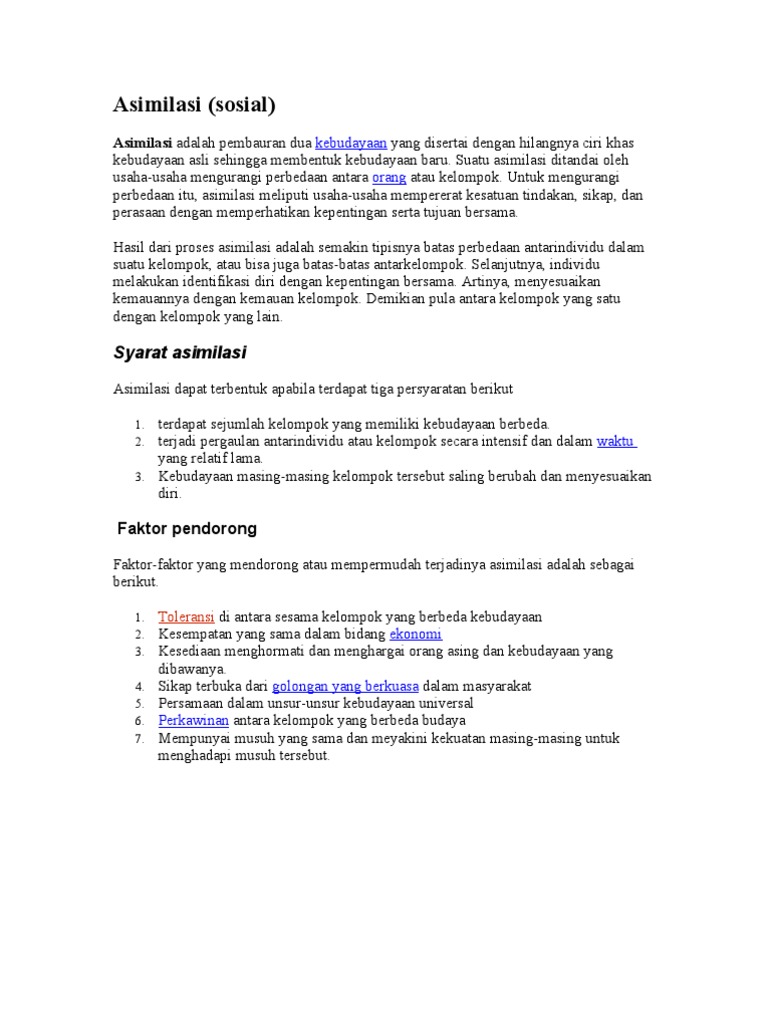 Asimilasi Asimilasi adalah proses perubahan sosial yang timbul jika ada dua individu atau kelompok dengan latar budaya yang berbeda kemudian berinteraksi dengan. 1Adanya rasa takut terhadap kebudayaan lain yang umumnya terjadi di antara masyarakat yang merasa rendah atau inferior dalam menghadapi. Faktor penghambat asimilasi.