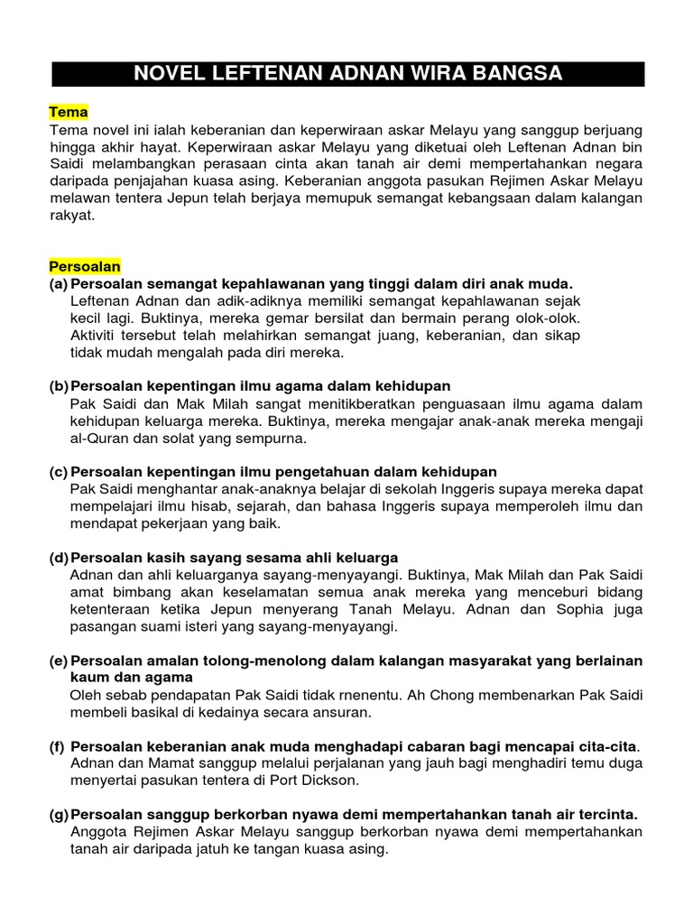 Novel leftenan adnan wira bangsa ini merangkumi nota bagi sinopsis tema dan persoalan watak dan perwatakan teknik plot plot. Sinopsis Bab Demi Bab Tema Persoalan Watak dan Perwatakan Latar Masa Latar Tempat Latar Masyarakat Plot Teknik Penceritaan Nilai Pengajaran Soalan. Novel leftenan adnan tingkatan 4 sinopsis tema persoalan watak perwatakan nilai pengajaran.